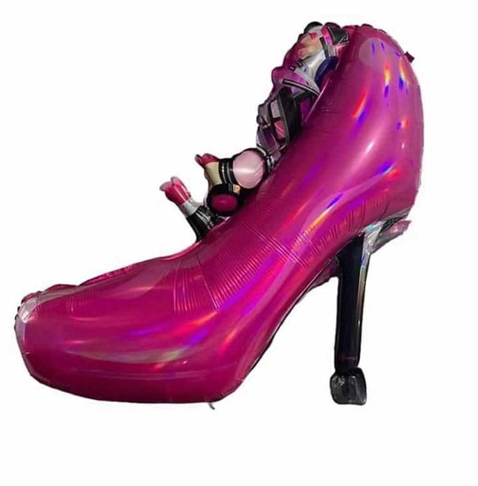 Balon foliowy o oryginalnym kształcie damskiej szpilki z dodatkowymi elementami ozdobnymi w kształci kosmetyków do makijażu.