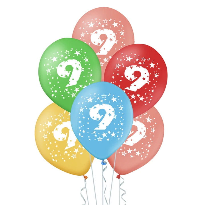 W opakowaniu znajduje się 5 sztuk balonów z nadrukiem z cyfrą 9.