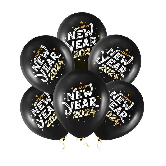 Balony lateksowe z nadrukiem Happy New Year 2024, idealna dekoracja sali na imprezę sylwestrową.Opakowanie 100szt,