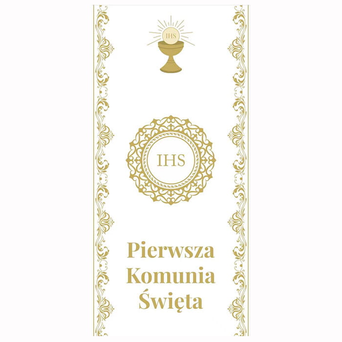 Bieżnik pierwsza komunia święta, biały ze złotym nadrukiem, wymiary 35cm x 5m.