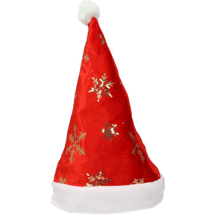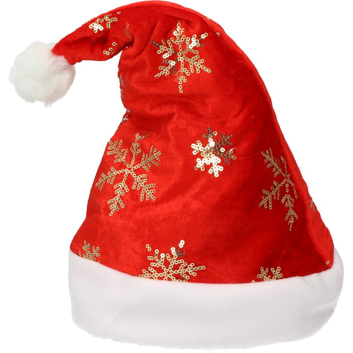Czapka Mikołaja ze złotymi śnieżynkami .Przebierz się w święta z pomocą wyjątkowego dodatku! Nie ma Gwiazdki bez czapki świętego Mikołaja... tak uważamy!Obwód ok:58cm.