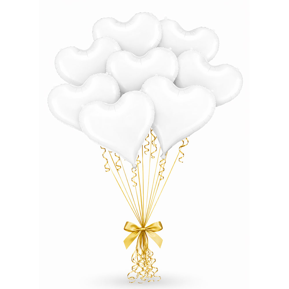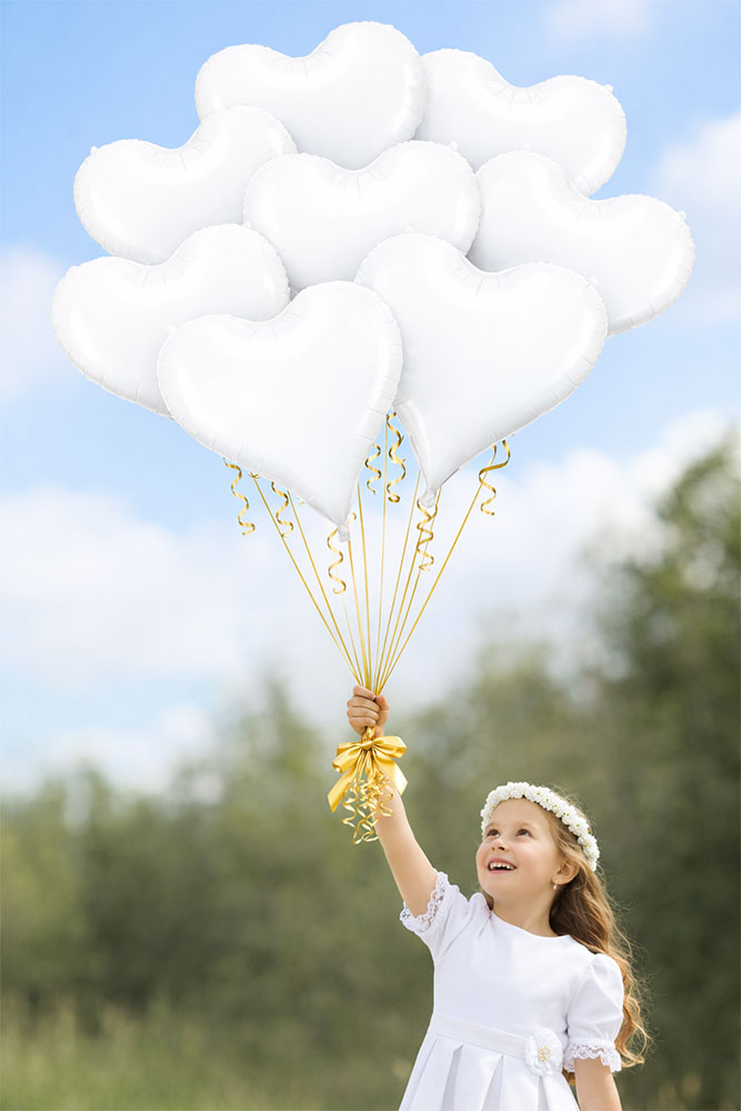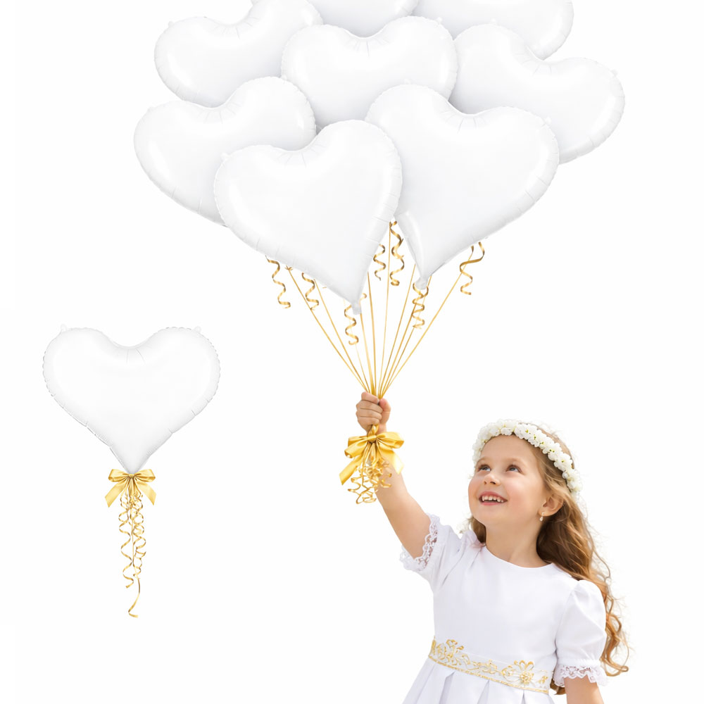 Elegancki zestaw 10 matowych balonów foliowych w kształcie serca w klasycznym białym kolorze. Idealne jako dekoracja na Pierwszą Komunię Świętą – do sali, domu, sesji zdjęciowej lub przyjęcia komunijnego.