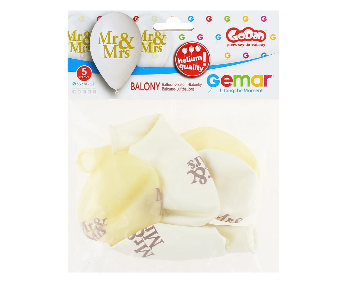 Balony 13", MR&MRS opakowanie 5szt. Balony w kolorze białym i mlecznym ze srebrnym nadrukiem