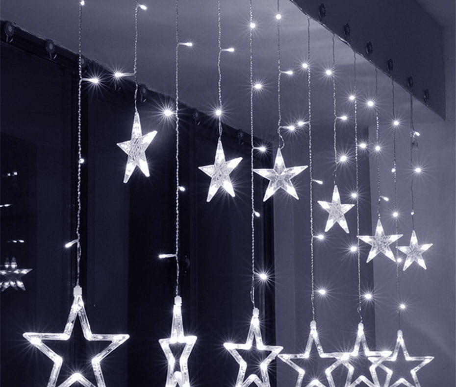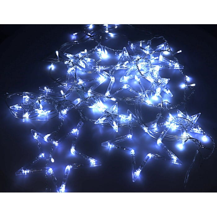 Kurtyna świetlna 3m, 136led, kolor biały zimny.Kutyna może być używany w wielu dziedzinach - zarówno jako ozdoba na Boże Narodzenie czy też zwykłe przyjęcie.Energooszczędne, intensywne światło.Przepalenie diody nie wygasza całego zestawu.Szerokość 3m, 6 gwiazdek dużych 16cm, 6 gwiazdek małych 9cm .