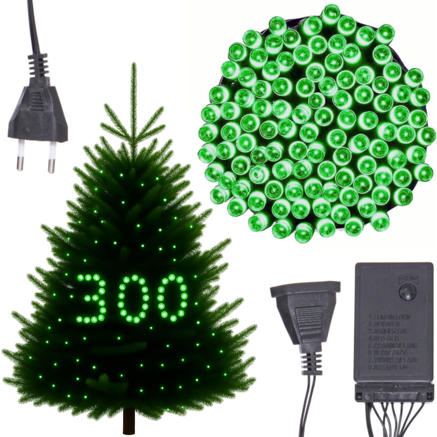 Dodaj blasku swoim świątecznym dekoracjom dzięki lampkom choinkowym wyposażonym w 300 mocnych diod LED emitujących zielone światło. Idealne do ozdobienia choinki, wnętrza domu czy ogrodu, tworząc magiczną atmosferę podczas świąt.