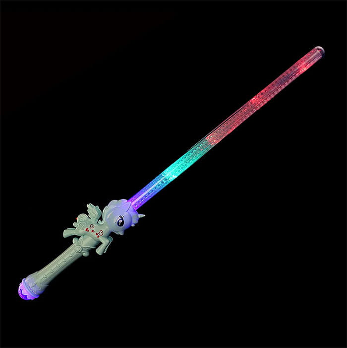 Ten unikalny miecz świetlny to nie tylko doskonała zabawka dla dzieci i fanów jednorożców, ale także idealny gadżet na imprezy i wydarzenia tematyczne. Jego efektowne światło, dźwięki i ruchy z pewnością przyciągną uwagę i rozbawią wszystkich uczestników.Efekty świetlne i dźwiękowe.Miecz zasilany bateriami paluszkami 3szt, brak baterii w zestawie.