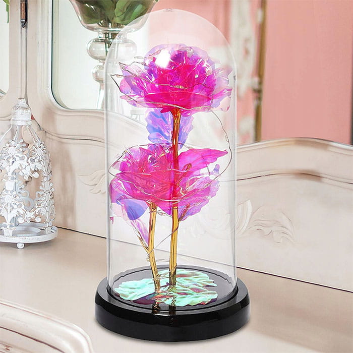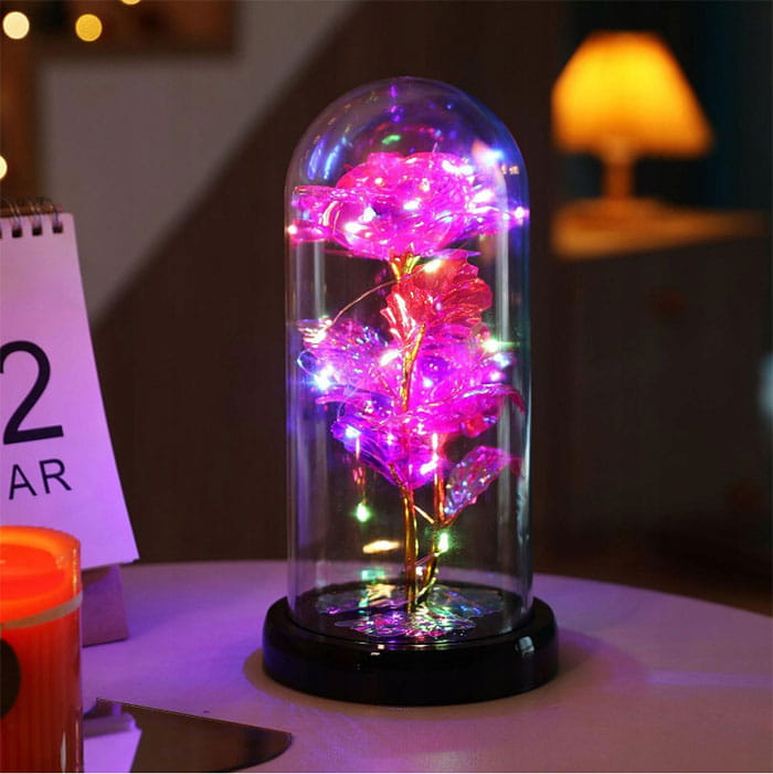 Otoczona lampkami LED róża w szkle może posłużyć jako romantyczna lampka. Stworzy niesamowity nastrój. Jej elegancki wygląd będzie pasować do każdego miejsca i na każdą okazję.