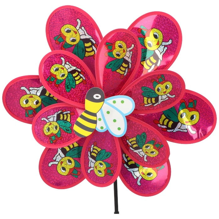 Wiatrak ogrodowy w pszczółki 75 cm,długość patyczka-55cm,długość całkowita-75cm,szerokość wiatraka ok-38cm.Kolor różowy