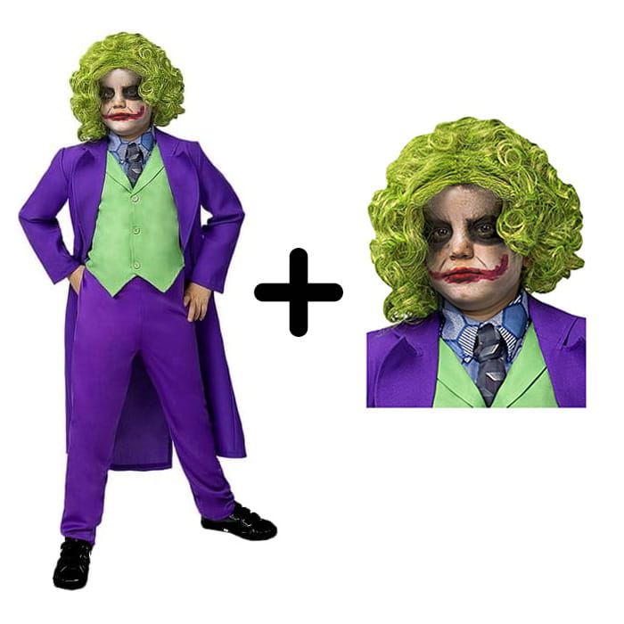 Nasz strój Jokera obejmuje fioletową marynarkę , spodnie, oraz zieloną kamizelkę i perukę . Jeśli chcesz dopełnić swoje przebranie, pomaluj twarz na biało, a następnie namaluj na niej złowrogi uśmiech z pomocą krwistoczerwonego kosmetyku, a także ciemne cienie pod oczami i załóż zieloną perukę.